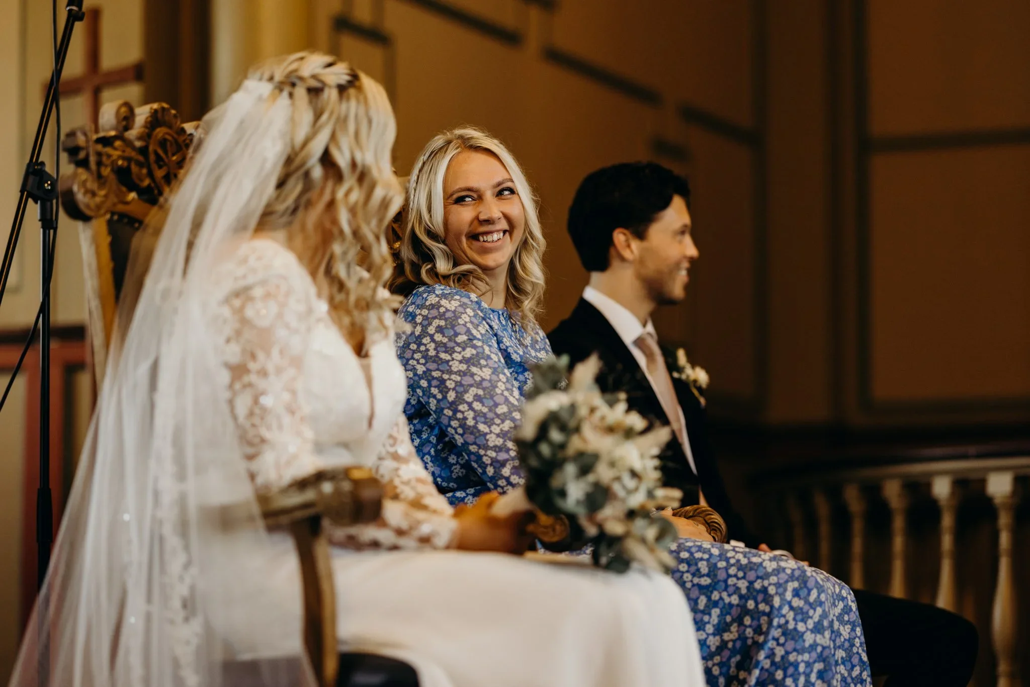 Bruk tre stoler på både bruden og brudgommens side, som vanlig, men få forloverne til å flytte over en stol fra brudens side når dere er viet, slik at forloverne sitter på en side etter vielsen, og brudeparet på den andre